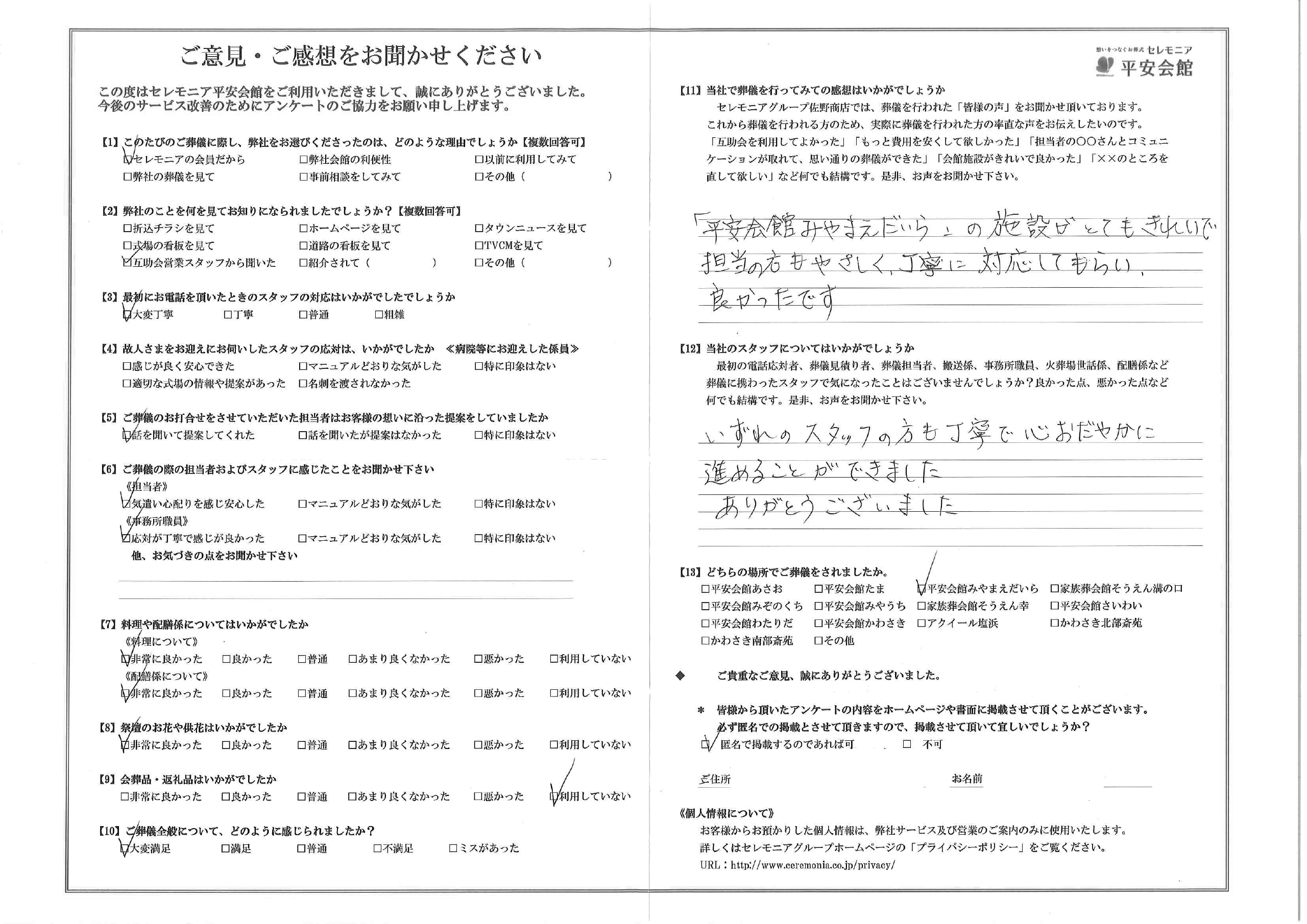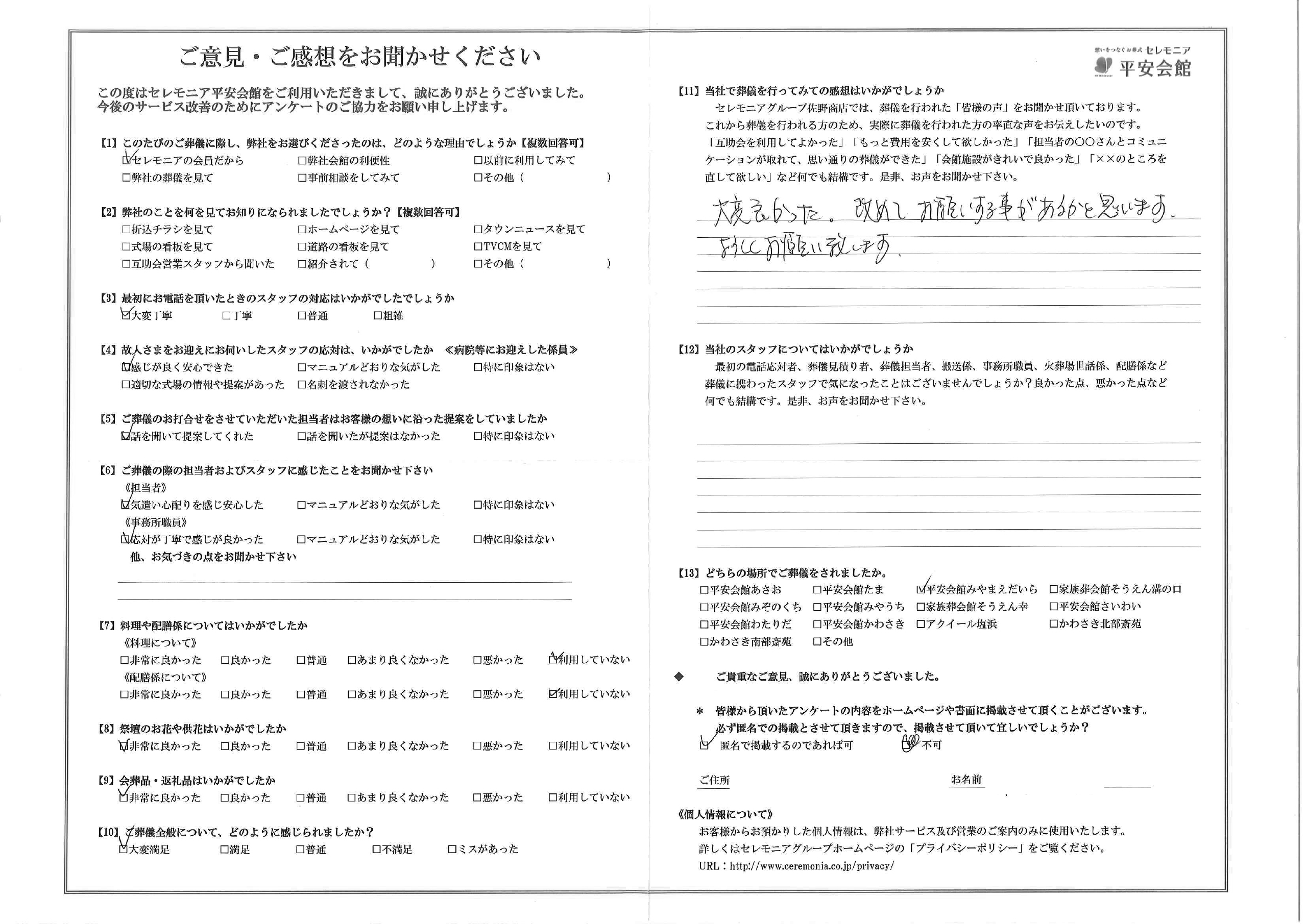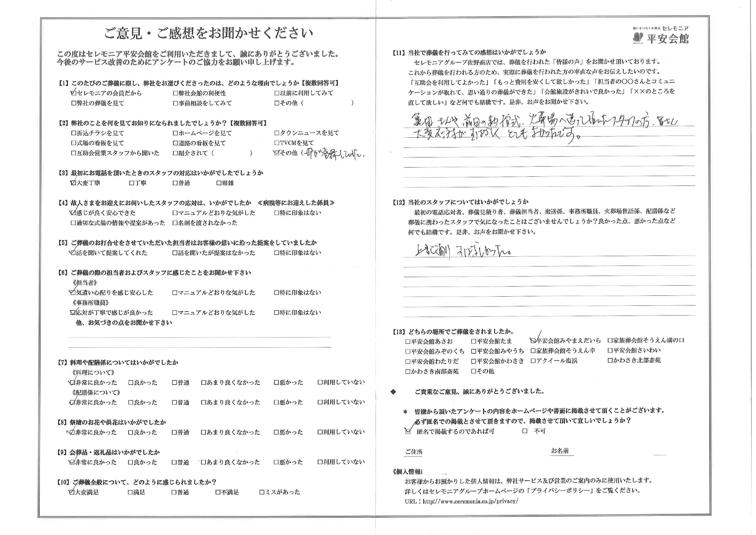 平安会館をご利用いただいたお客さまより、感謝のお声を頂きました