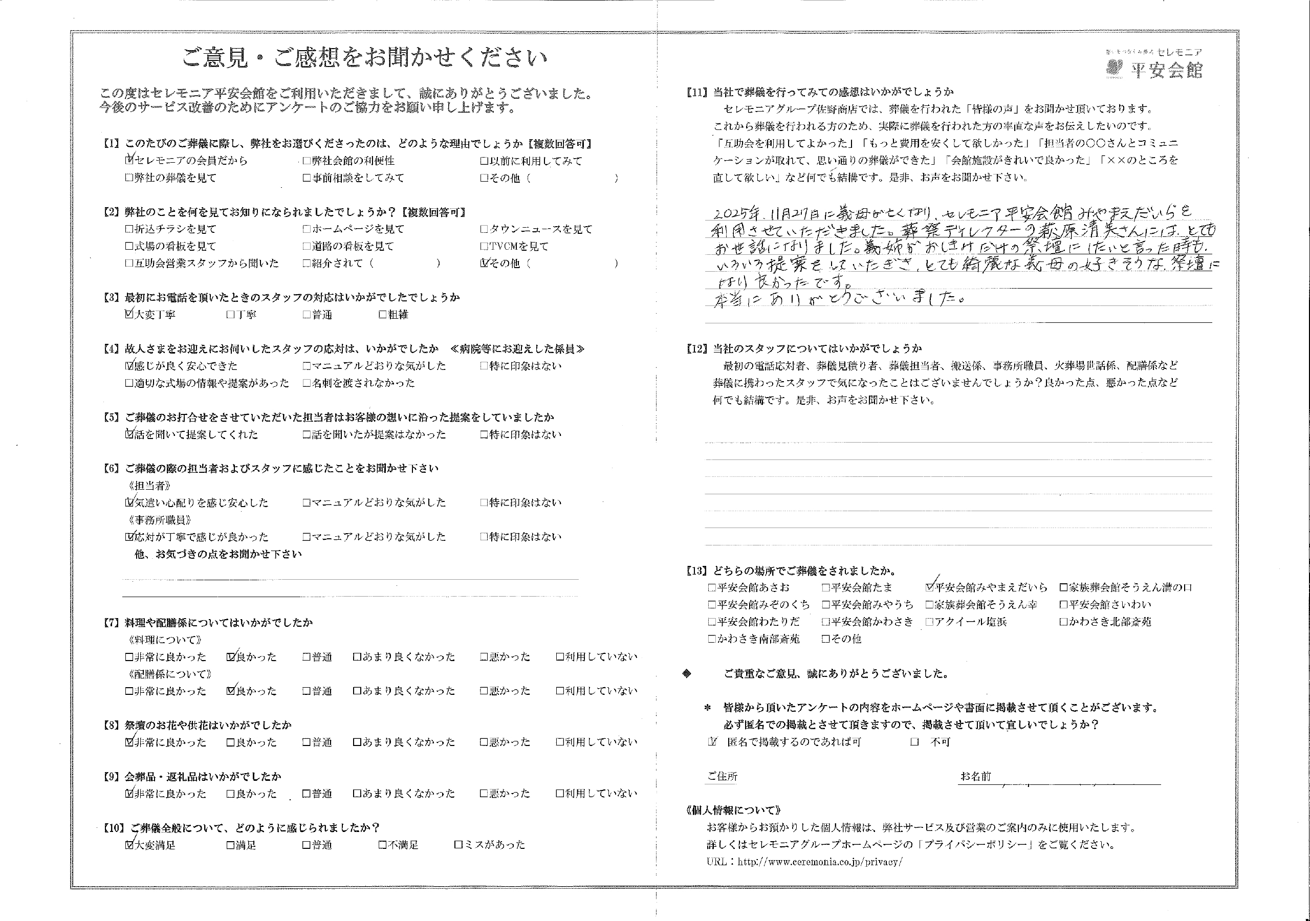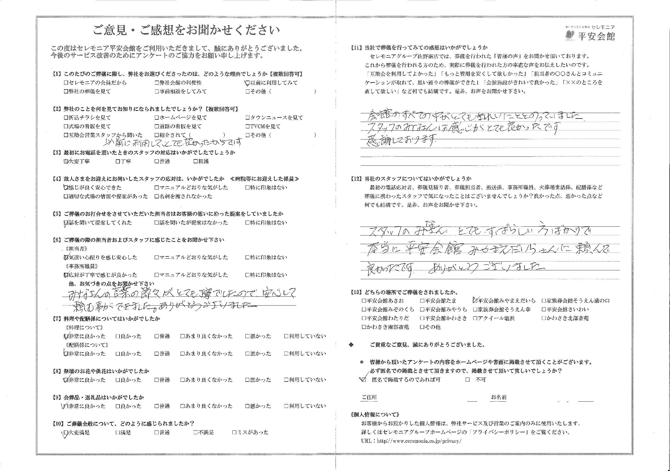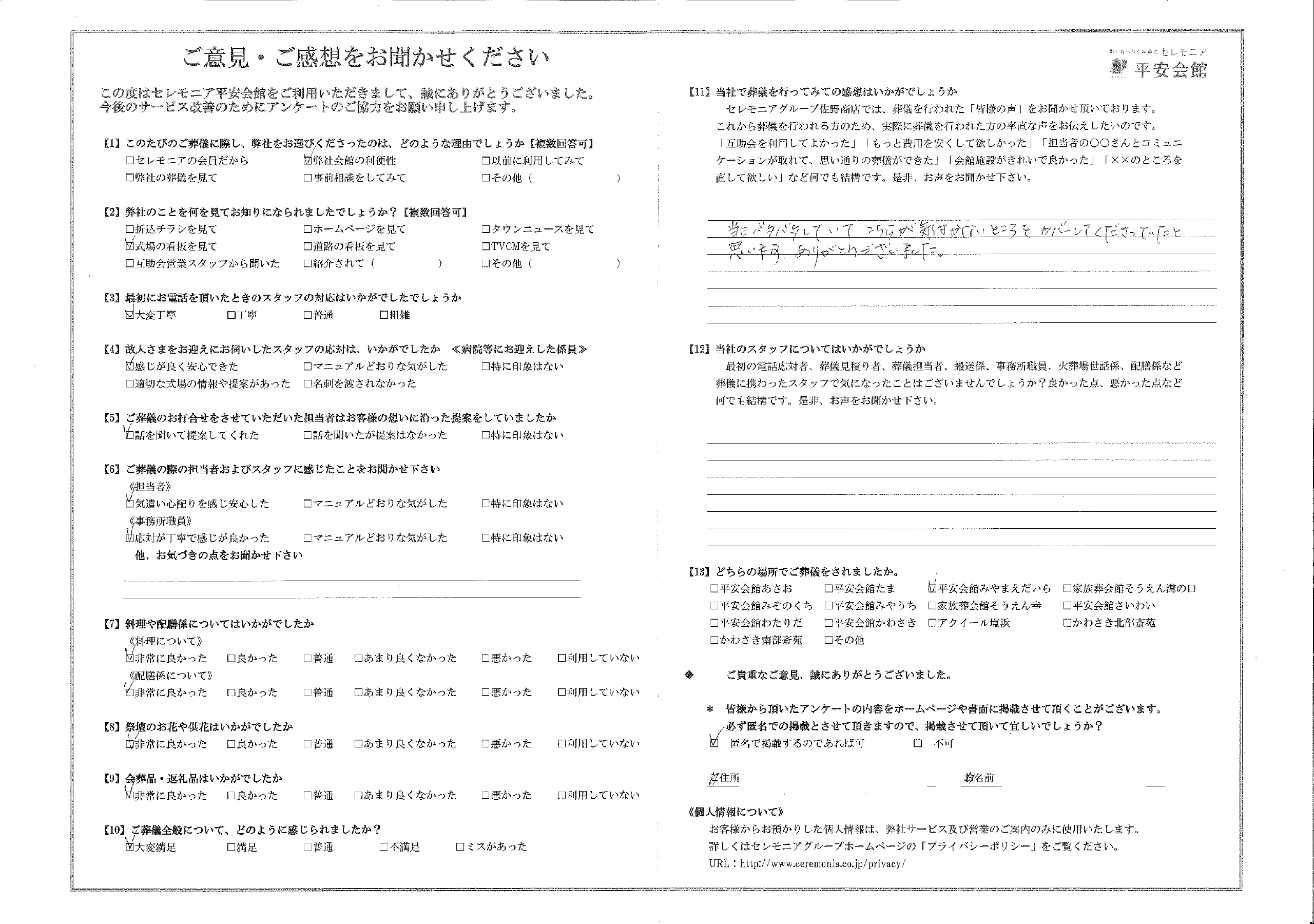 平安会館をご利用いただいたお客さまより、感謝のお声を頂きました